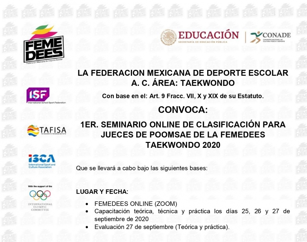 CONVOCATORIA FEMEDEES SEMINARIO ONLINE PARA CLASIFICACION DE JUECES DE POOMSAE 2020